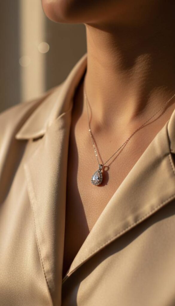 Adorn your décolletage with the timeless elegance of a delicate diamond pendant necklace. A single, brilliant diamond, perhaps bezel set or surrounded by a halo of smaller stones, rests gracefully at the hollow of your throat. Its understated sparkle catches the light with quiet intensity, adding a touch of refined luxury without ostentation. Feel the cool metal chain against your skin, a comforting weight that speaks of enduring beauty. This piece offers a sophisticated focal point, drawing the eye gently and adding a subtle, exquisite shimmer that complements any neckline beautifully.