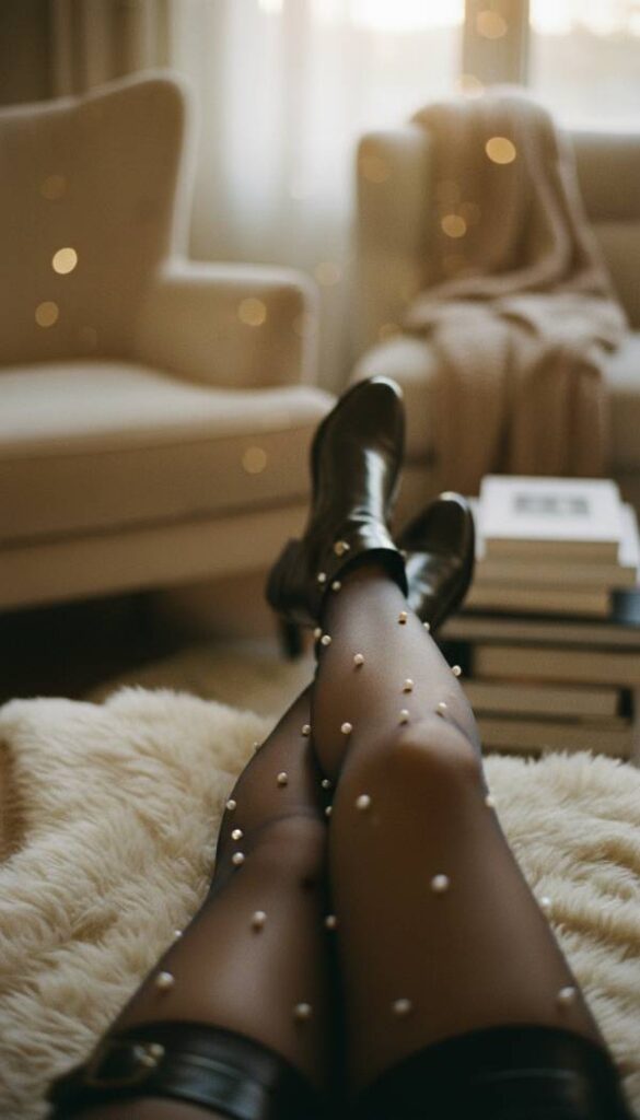 Add an unexpected layer of elegance with sheer tights featuring subtle embellishments, such as tiny pearls, delicate embroidery, or a refined polka dot pattern. These tights offer a hint of warmth and coverage while introducing a charming, unique texture to your legs. Imagine the delicate patterns appearing as you move, a tasteful surprise that elevates the entire look. The sheer fabric allows your skin tone to peek through, maintaining a sophisticated air. This small detail can make a significant impact, transforming a simple dress into a more intricate and fashion forward statement, perfect for a winter event.