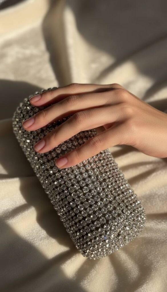 Complete your look with a dazzling crystal embellished clutch, a small but mighty accessory that exudes glamour. Each facet of the crystals catches and refracts light, creating a continuous, enchanting sparkle. The weight of the clutch in your hand feels substantial, a testament to its quality and intricate craftsmanship. Its compact size ensures you carry only essentials, maintaining a sleek, sophisticated profile. This clutch is more than just a bag; it is a piece of jewelry for your hands, adding a final, exquisite touch of brilliance to your winter wedding guest attire, making it truly unforgettable.