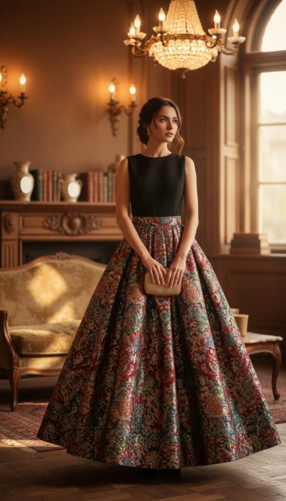 Embrace regal elegance with a brocade skirt paired with a structured, minimalist top. The brocade fabric, with its raised, intricate patterns woven in metallic threads or rich, deep colors, offers a captivating visual and tactile experience. Its substantial weight and luxurious feel exude opulence. A complementary structured top, perhaps in a simple silk or velvet, allows the skirt to be the undeniable focal point, balancing its ornate beauty. This ensemble feels incredibly special and unique, perfect for a winter wedding that calls for a touch of historical grandeur and artistic flair, creating a memorable aesthetic.