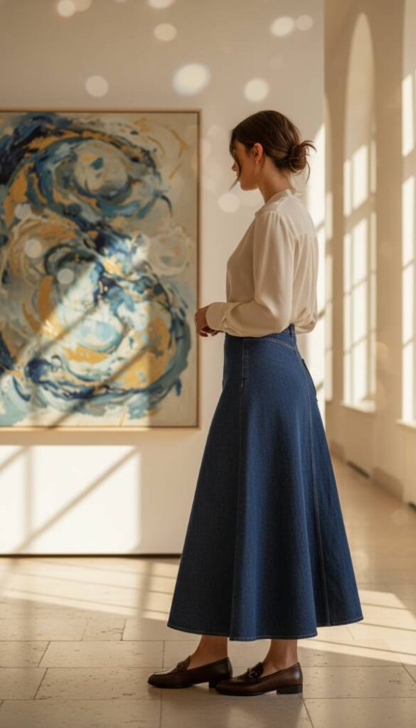 Imagine a rich indigo denim midi skirt, its soft fabric gracefully skimming the calf, paired with a luxurious silk blouse in a muted cream hue. The blouse, with its subtle sheen, feels incredibly smooth against the skin, while the skirt’s sturdy yet supple texture offers a comforting embrace. A pair of elegant leather loafers, their polished surface reflecting ambient light, completes this timeless look. The gentle swish of the skirt as one moves creates a subtle, appealing whisper, signaling understated sophistication. This outfit balances structured elegance with casual ease, perfect for a refined daytime affair.
