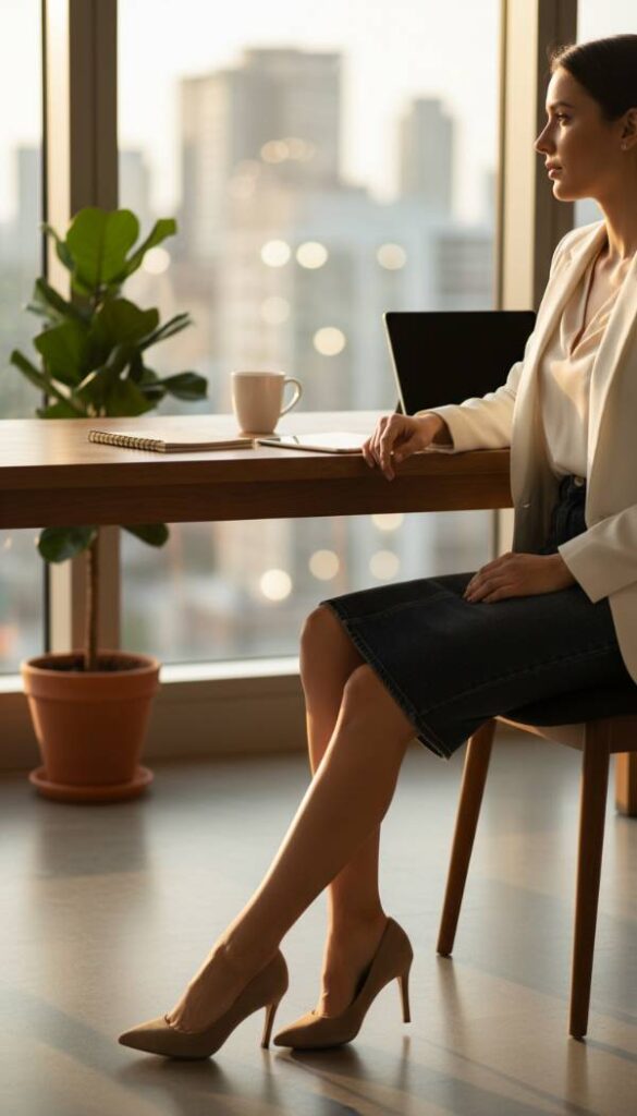 Project an aura of refined power with a perfectly tailored dark wash denim pencil skirt, designed to accentuate the feminine form with polished precision. Its substantial yet comfortable fabric holds its shape impeccably, providing a sleek foundation. Pair this with a crisp, impeccably fitted white tailored blazer, its sharp lines offering a striking contrast to the denim’s softer texture. The blazer’s smooth lining whispers quality, while the skirt’s rich color feels deep and inviting. Delicate pointed toe pumps, their slender heels adding height and grace, complete this sophisticated ensemble, ideal for boardroom meetings or chic lunch dates.