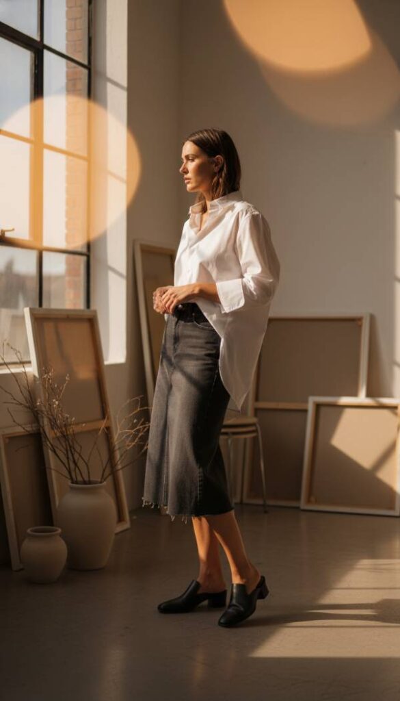 Embrace contemporary elegance with a clean, raw hem denim skirt in a muted charcoal wash, its unfinished edge adding a subtle touch of modernity without sacrificing sophistication. The substantial denim feels soft yet structured, holding its shape beautifully. Pair this understated skirt with a crisp, impeccably tailored white oversized shirt, its architectural lines and breathable cotton providing a sharp, refreshing contrast. The shirt’s smooth fabric drapes beautifully, while the skirt’s raw edge adds an interesting textural detail. Sleek leather mules, their simple design enhancing the minimalist vibe, complete this effortlessly chic ensemble.