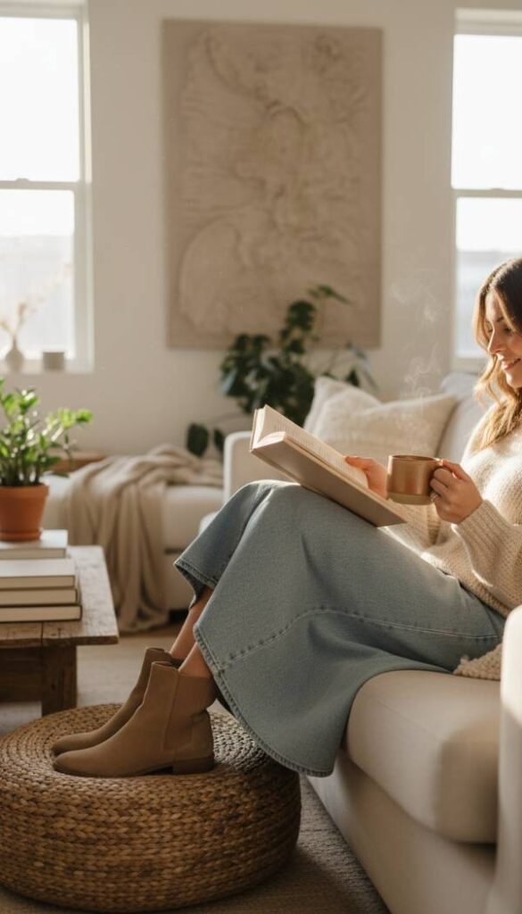 Indulge in understated luxury with a perfectly cut A line denim skirt in a pristine light wash, its clean lines offering a universally flattering silhouette. The soft yet structured denim feels comfortable and substantial. Elevate this piece with a sumptuous cashmere sweater in a creamy oat shade, its incredibly soft and warm texture a delight against the skin. The sweater’s gentle drape contrasts beautifully with the skirt’s subtle rigidity. Suede ankle boots, their velvety finish adding another layer of tactile pleasure, complete this effortlessly chic ensemble, ideal for comfortable yet elegant everyday wear. This look whispers sophistication without shouting.