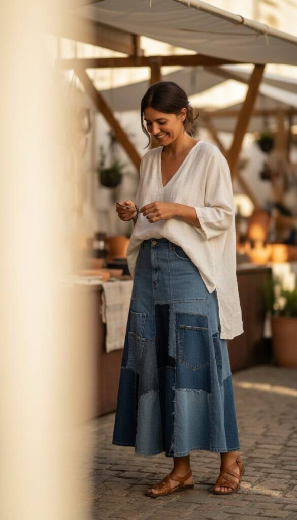 Showcase your artistic sensibilities with a unique patchwork denim skirt, each panel telling its own subtle story through varying shades and textures of blue. This visually interesting piece feels wonderfully individual, offering a tactile experience with its varied surfaces. Pair it with a flowy, natural linen tunic, its relaxed silhouette and breathable fabric providing a comfortable, earthy contrast. The skirt’s robust construction grounds the outfit, while the tunic’s soft, crinkled texture adds an organic touch. Artisanal leather sandals, their handcrafted details evident, complete this creative ensemble, perfect for gallery visits or leisurely weekend brunches.