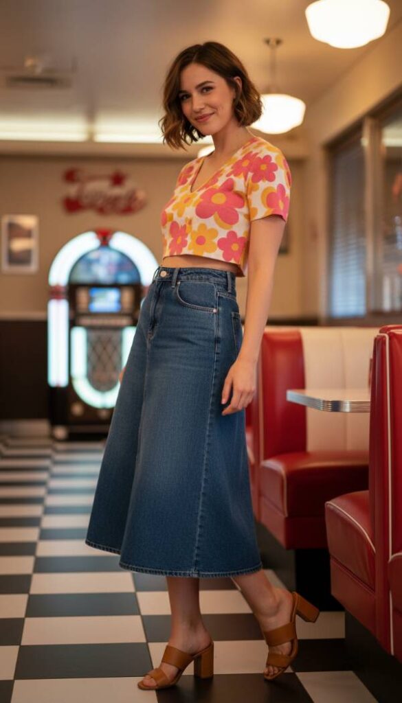 Channel retro glamour with a high waisted indigo denim skirt, its flattering cut cinching the waist and elongating the legs. The sturdy denim evokes a sense of enduring quality and feels substantial. Complement this vintage inspired piece with a charming retro style crop top, perhaps featuring a delicate floral print or a playful polka dot pattern. The top’s lighter fabric creates a lovely contrast with the skirt’s robust texture. Block heeled sandals, their design echoing past eras, complete this delightful ensemble. This outfit is perfect for creating a memorable, playful look that celebrates timeless fashion with a contemporary twist.