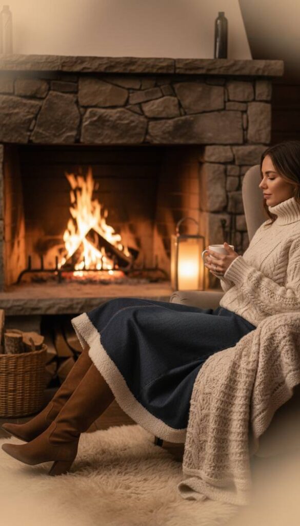 Brave the chill in ultimate style with a beautifully lined denim midi skirt, its interior offering unexpected warmth and comfort without bulk. The rich, dark wash denim feels substantial and luxurious, promising both durability and elegance. Pair this cozy yet chic skirt with a chunky knit turtleneck sweater in a deep, comforting shade, its soft wool texture providing supreme warmth and a tactile delight. The sweater’s relaxed fit balances the skirt’s structured silhouette. Knee high suede boots, their plush material adding a touch of opulence, complete this inviting ensemble. This outfit is perfect for crisp autumn days or chilly winter evenings.