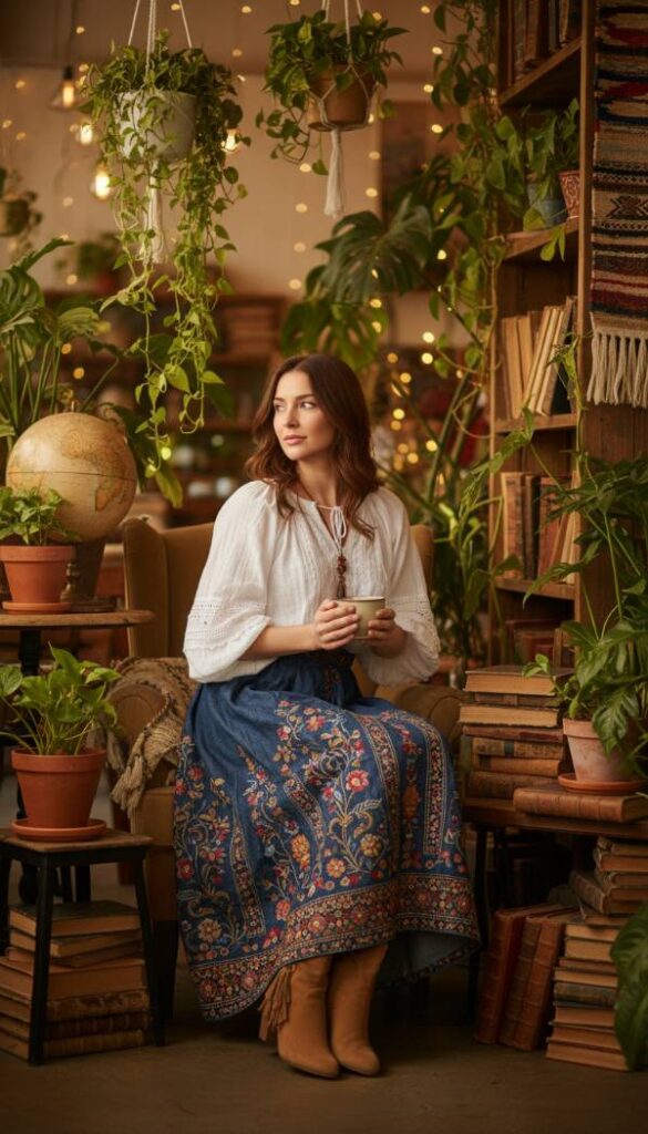 Embrace a free spirited yet opulent aesthetic with an elaborately embroidered maxi denim skirt, its delicate floral patterns blooming across a deep blue canvas. This floor length skirt pairs beautifully with a billowy peasant top crafted from sheer cotton voile, featuring delicate lace inserts that add a touch of romanticism. The skirt’s substantial weight provides a grounding presence, while the top’s light airy fabric creates a sense of ethereal grace. Soft suede ankle boots, their textured finish adding depth, complete this enchanting ensemble, resonating with a confident, artistic spirit. The entire look invites touch and visual appreciation.