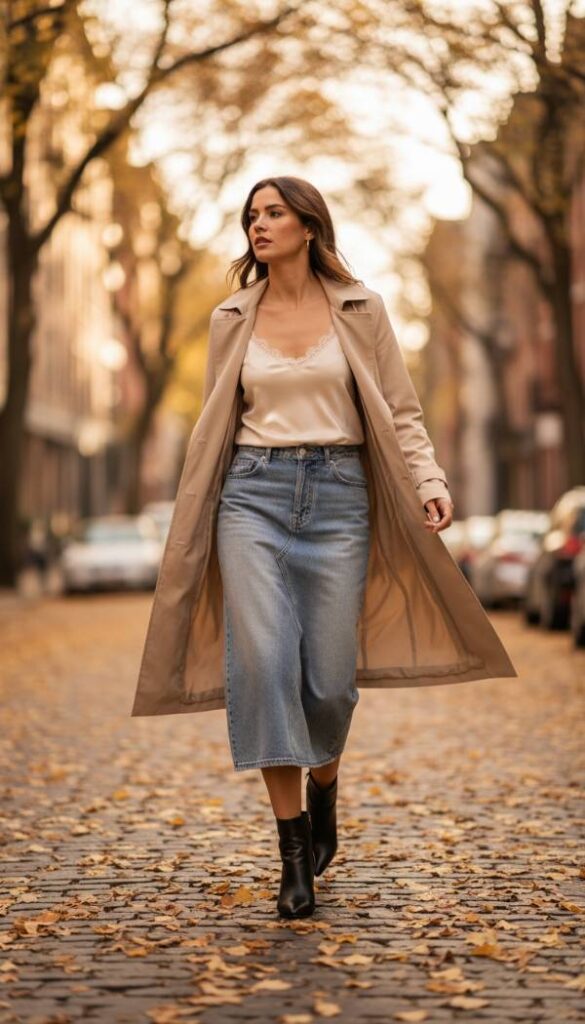 Navigate the unpredictable in between seasons with a versatile light wash denim skirt, its classic appeal making it a foundational piece. The soft, faded denim offers a comforting familiarity while remaining fashion forward. Layer over it a lightweight trench coat, its elegant drape and smooth, water resistant fabric offering both style and practicality. The trench’s structured lines provide a sophisticated contrast to the denim’s casual texture. A simple silk camisole underneath offers a touch of luxury. Ankle boots, their sleek profile adding a refined touch, complete this adaptable ensemble. This look is perfect for managing changing temperatures with graceful style.