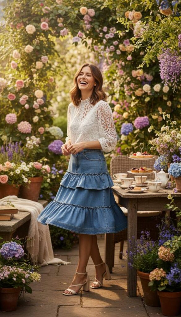 Infuse your style with romantic charm through a denim skirt featuring delicate ruffles cascading gracefully along its hem. The playful ruffles add movement and softness to the sturdy denim, creating a captivating visual. Pair this unique skirt with a delicate lace top, its intricate patterns and sheer details offering a beautiful textural contrast. The lace feels whisper light against the skin, while the denim provides a comforting embrace. Strappy block heels, their design adding a touch of contemporary elegance, complete this enchanting ensemble. This outfit beautifully merges structured denim with feminine softness, ideal for a charming date night or garden party.