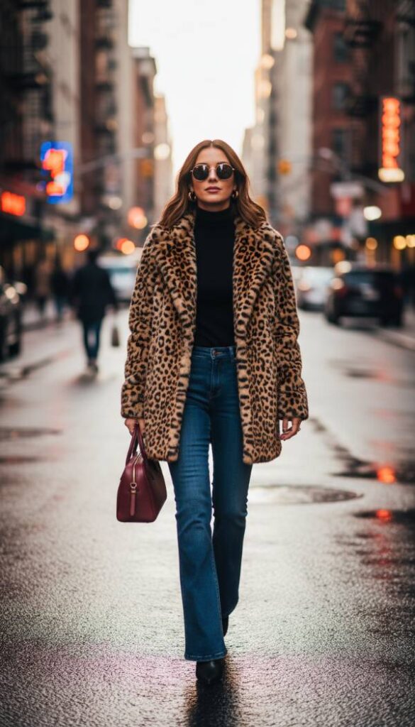 Embrace a daring yet refined aesthetic with an oversized faux fur coat in a rich animal print, layered over a sleek black turtleneck and dramatic dark wash flare jeans. This look channels a powerful, unapologetically glamorous vibe, perfect for making an entrance. Accessorize with substantial gold jewelry and a structured handbag to complete the high end ensemble. The interplay of luxurious textures and bold patterns creates an alluring, confident statement, reflecting a woman who commands attention with her sartorial choices. Ensure the faux fur has a deep, plush pile for maximum impact and an expensive feel.