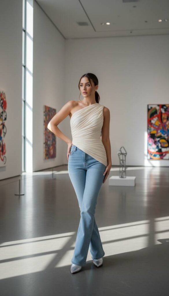 Embrace architectural forms with an artfully draped, one shoulder top in a rich jewel tone, paired with clean wash light blue flare jeans. The top’s unique silhouette provides a compelling focal point, transforming a simple outfit into a high fashion statement. Complement with minimalist strappy heels and delicate gold tone earrings to maintain the refined aesthetic. This look speaks to a discerning taste for modern design, showcasing how sculptural elements can elevate everyday denim into something truly extraordinary. It is an ensemble for the woman who appreciates innovation and understated drama in her attire.