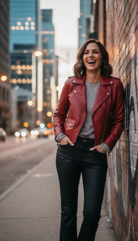 Infuse vibrant energy into your wardrobe with a striking cherry red leather jacket as the focal point. Layer it over a subtly shimmering metallic knit top and pair with sleek, coated black flare jeans for an edgy, elevated appeal. This bold color choice, a major trend, adds an immediate sense of dynamism and modern chic. Finish the look with black ankle boots that have a pointed toe, and a minimalist black clutch. This ensemble is for the woman who dares to make a vivid statement, blending audacious color with timeless luxury materials for a truly impactful presence.