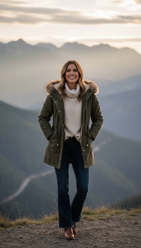 Redefine utilitarian chic with a luxurious, waterproof anorak jacket in a muted, earthy tone, crafted from a technical yet refined fabric. Layer it over a fine gauge cashmere crew neck sweater and pair with deep indigo flare jeans. This ensemble skillfully blends outdoor inspired functionality with high fashion sensibilities. Complete the look with designer hiking boots that feature a sleek, modern design and a structured cross body bag. This outfit is for the adventurous yet style conscious lady, proving that practicality can be utterly luxurious and undeniably fashionable, even in rugged environments.