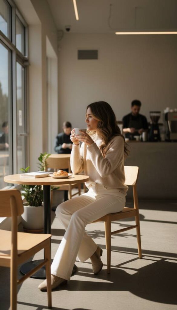 Experience the epitome of understated elegance with a richly textured, oatmeal colored cashmere sweater, embodying quiet luxury. Its relaxed fit and sumptuously soft feel make it an indulgent choice for everyday wear. Pair this with wide leg, cream colored flare jeans in a substantial denim for a monochromatic, sophisticated aesthetic. Complete the ensemble with pointed toe ballet flats in a complementary neutral hue and a minimalist leather cross body bag. This look is a testament to the power of high quality basics and thoughtful layering, perfect for the lady who values comfort and unparalleled craftsmanship.
