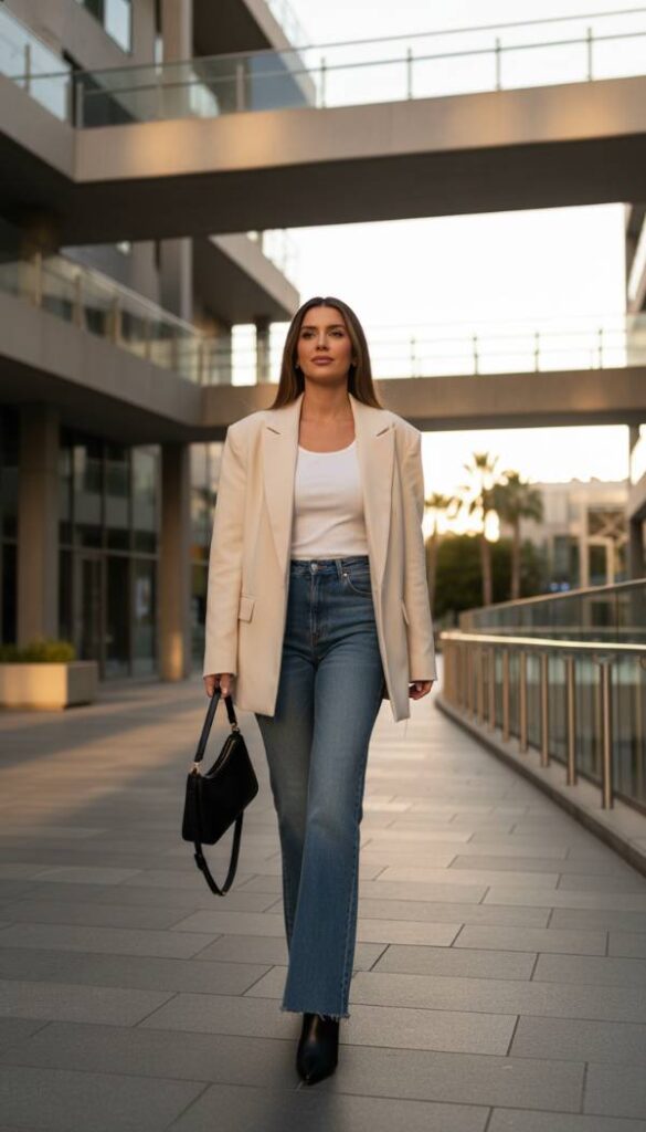 Make a commanding statement with a structured blouse featuring exaggerated power shoulders, crafted from a luxurious silk blend fabric. This piece redefines modern power dressing, offering a sophisticated nod to iconic silhouettes. Pair it with deep rinse, dark wash flare jeans that create a long, lean line. Complete the look with high heel ankle boots for added height and drama, and a minimalist clutch. This ensemble is for the confident lady who embraces strong sartorial statements, showcasing a powerful femininity that is both elegant and undeniably current in its sophisticated execution.