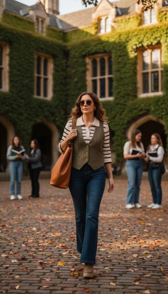 Reinvent the preppy aesthetic with a sophisticated twist, featuring a fine gauge striped knit polo shirt paired with a tailored tweed vest in a heritage pattern. This combination offers a clever play on classic motifs while maintaining a contemporary edge. Team this with dark wash, impeccably fitting flare jeans for a polished silhouette. Finish the look with classic penny loafers and a sleek satchel bag, lending an air of intellectual charm. This outfit is for the lady who enjoys tradition but insists on a fresh, modern interpretation in her refined daily attire.