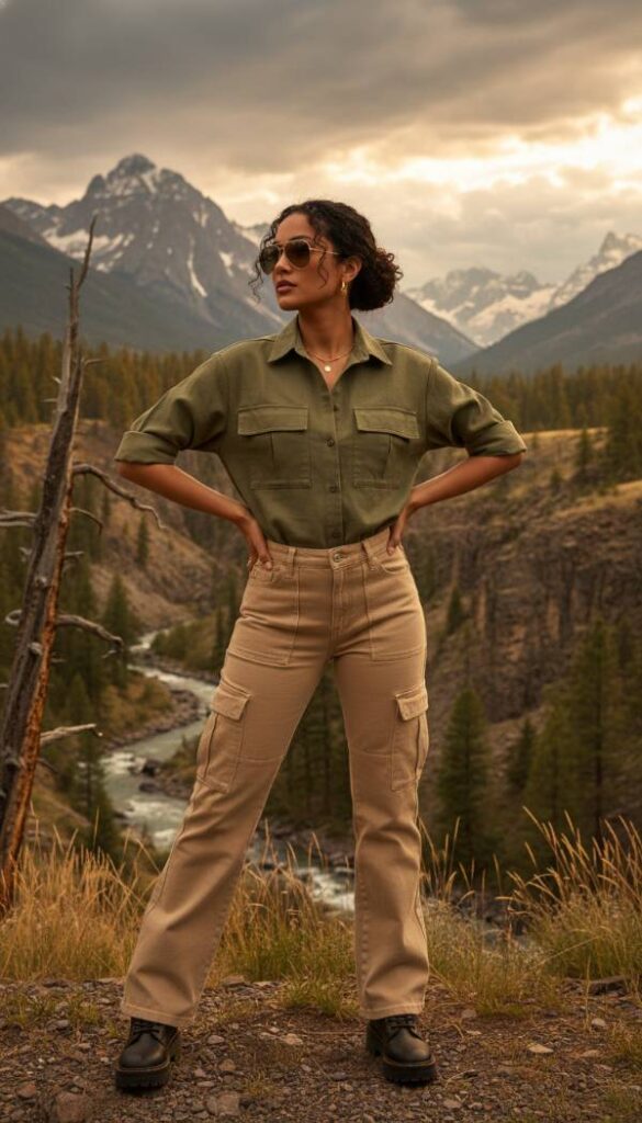 Reimagine utility wear with a tailored safari inspired shirt, featuring refined flap pockets and a structured collar, crafted from a luxurious cotton twill. Pair this with cargo style flare jeans in a matching or complementary olive green or khaki tone, which offer a modern, sophisticated take on a practical silhouette. Ground the look with chunky sole boots that provide an edgy contrast and a utilitarian inspired canvas tote bag. This ensemble is for the lady who appreciates functional fashion with an elevated, contemporary twist, blending rugged charm with refined tailoring.
