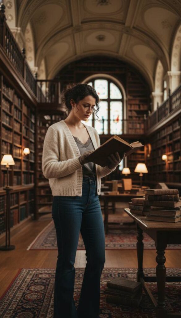 Curate a scholarly yet stylish aesthetic with a rich bouclé knit cardigan in a deep, sophisticated hue like forest green or burgundy. Layer it over a luxurious silk camisole for a touch of refined sensuality. Pair this with dark wash, tailored flare jeans that offer a polished and elongated silhouette. Complete the intellectual inspired look with classic leather brogues and a vintage inspired satchel bag. This ensemble is perfect for the lady who embodies a love for literature and learning, blending academic charm with an effortlessly chic and expensive appeal in her daily attire.