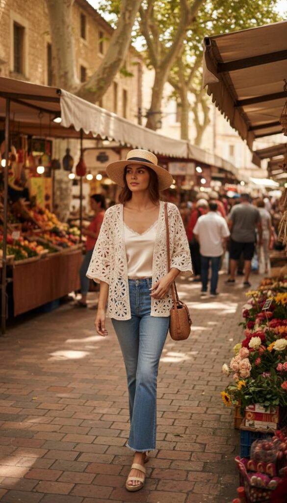 Infuse bohemian charm with a high end twist by choosing an intricately crocheted top or tunic in an earthy tone, featuring delicate openwork details. Layer it over a silk camisole for modesty and pair with raw hem, light wash flare jeans, adding a touch of laid back luxury. Espadrille wedges with fine leather straps will elongate the legs while maintaining the relaxed, artisanal feel. This ensemble celebrates craftsmanship and natural textures, offering a sophisticated interpretation of a free spirited aesthetic. It is perfect for the lady who appreciates unique, handcrafted elements in her curated wardrobe.