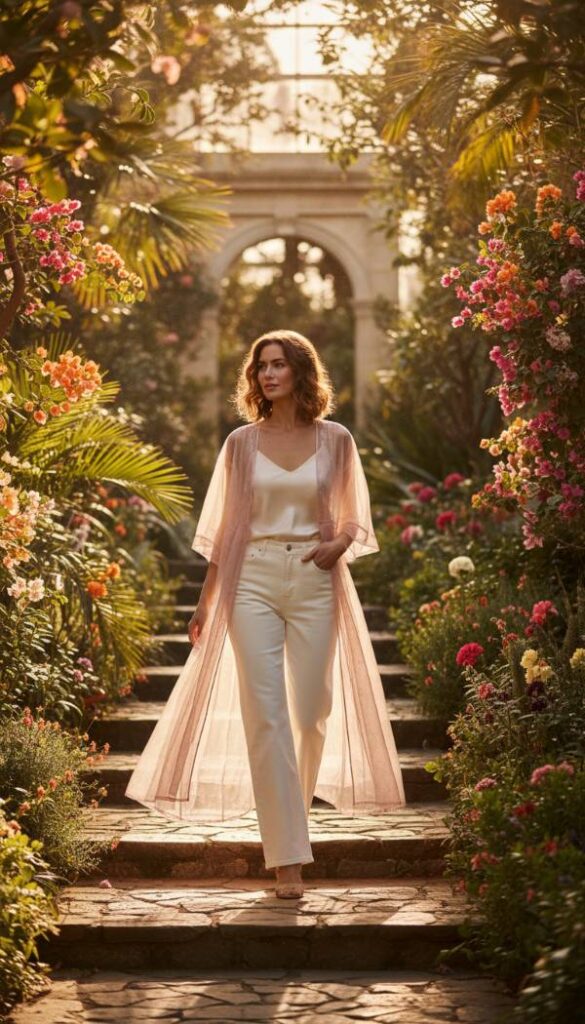 Embrace a delicate and refined aesthetic with a long, flowing sheer tunic in a soft neutral hue, gracefully layered over a tonal silk camisole. This creates an ethereal, sophisticated transparency that is both alluring and elegant. Pair this with pristine ivory colored flare jeans for a light, airy ensemble perfect for warmer seasons or elevated casual events. Complete the look with delicate strappy sandals and subtle pearl accessories to enhance the sophisticated, feminine allure. This outfit is for the lady who appreciates subtlety and graceful movement in her luxurious wardrobe choices.
