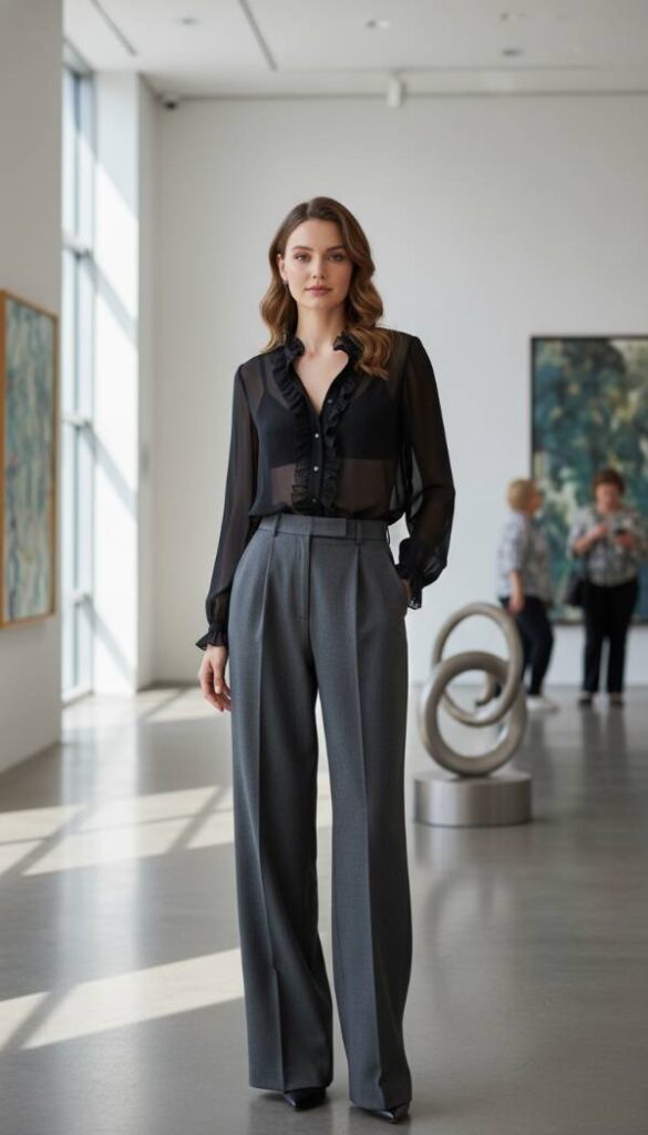 Sheer Organza Blouse And Tailored Trousers
