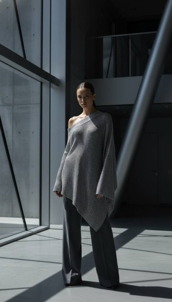 Embrace futuristic elegance with a metallic silver asymmetrical knit top, a contemporary garment that effortlessly captures attention. The shimmering silver hue reflects light beautifully, creating a dynamic visual effect, while the asymmetrical cut introduces an element of modern artistry and unexpected allure. This piece is designed for impact, offering a high fashion edge without sacrificing comfort thanks to its knit construction. Pair it with sleek black trousers or a refined midi skirt to balance its bold statement. It is an ideal choice for the lady who loves to stand out with sophisticated flair.