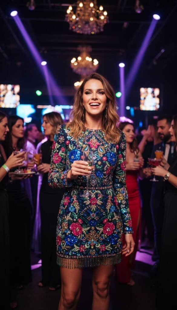 Redefine casual chic with an embellished dark wash denim mini dress, offering a fresh, elevated take on a classic fabric. This is not your everyday denim; imagine intricate beadwork, delicate crystal detailing, or perhaps subtle embroidery that transforms the garment into a true statement piece. The dark wash lends itself to evening wear, creating a sophisticated backdrop for the embellishments to truly shine. Paired with elevated heels and minimalist accessories, this dress is perfect for a lively Galentine’s party, blending playful youthfulness with sophisticated craftsmanship.