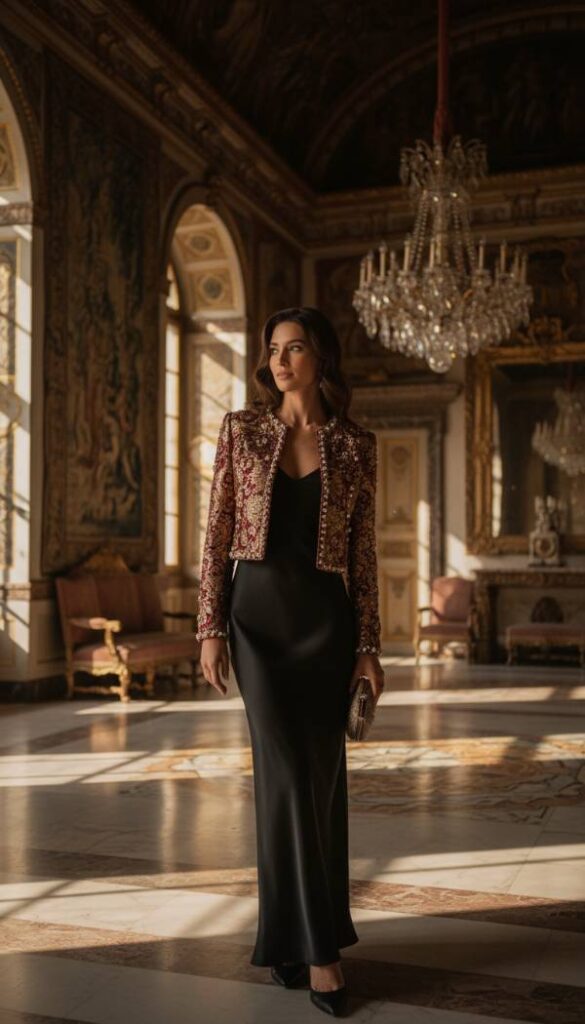 Elevate any simple outfit into an extraordinary statement with an ornate brocade cropped jacket. This exquisite piece, often featuring intricate patterns woven into rich, textured fabric, brings a sense of historical grandeur and artistic flair to modern dressing. The cropped length offers a contemporary edge, ensuring it pairs beautifully with high waist trousers or an elegant dress. Its luxurious material and detailed craftsmanship make it a true focal point, transforming a modest ensemble into one of unparalleled sophistication and unique personality. It is the ultimate finishing touch for a discerning lady.