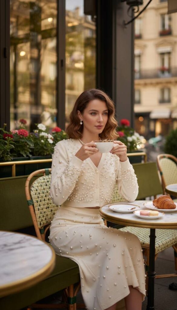 Embrace a refined, feminine aesthetic with a pearl adorned cropped cardigan and matching midi skirt set. This coordinated ensemble exudes sophisticated charm, with delicate pearls meticulously hand sewn onto a luxurious knit fabric. The cropped cardigan offers a modern silhouette, perfectly complementing the elegant drape of the midi skirt. This two piece set provides an air of coordinated luxury, ideal for a chic Galentine’s brunch or an intimate dinner. It is a timeless yet utterly current statement of graceful elegance and attention to detail.