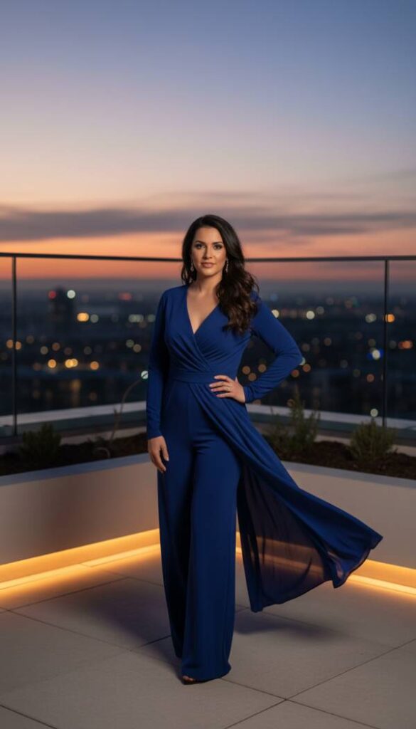 The draped wrap effect jumpsuit is a sophisticated answer to effortless elegance, perfectly aligning with modern comfort oriented luxury. Constructed from a fluid jersey or stretch crepe, it features a carefully designed wrap style bodice that creates a flattering V neckline and natural waist definition. The ingenious draping over the midsection provides exceptional camouflage for a big tummy, while the wide leg trousers ensure an elongated, balanced silhouette. This one piece wonder offers both comfort and undeniable style, making it ideal for events where you desire a polished yet relaxed glamour.