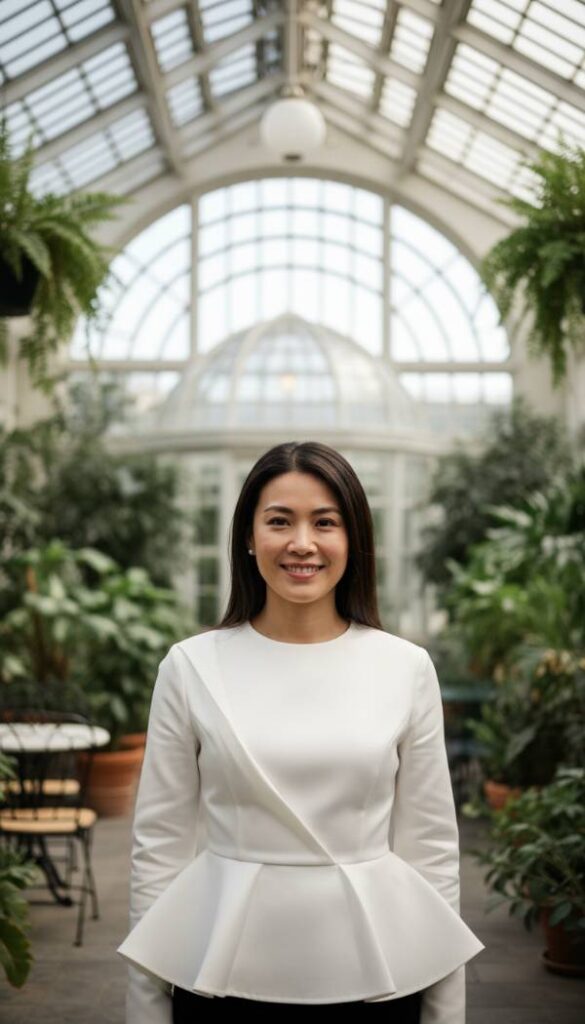 Reimagining the peplum, this 2026 iteration offers architectural precision and flattering form. Crafted from crisp cotton poplin with a touch of elastane, this blouse features a subtly flared peplum that begins just above the natural waist, expertly camouflaging the tummy area while accentuating the narrowest part of the torso. The structured shoulders and elegant V neckline add a touch of drama, creating a balanced silhouette. Its sophisticated design avoids excessive volume, ensuring a sleek and modern appearance that pairs seamlessly with tailored trousers or pencil skirts for a polished, contemporary look.