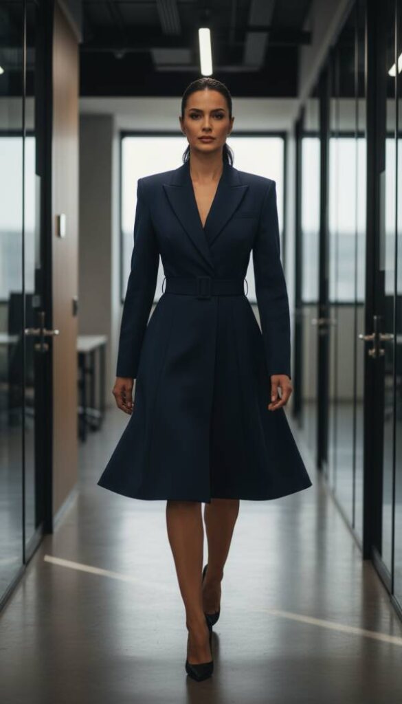 Embrace the powerful femininity of the Office Siren aesthetic with a structured belted blazer dress. Crafted from a high quality suiting fabric, this piece features a sharp, tailored silhouette with defined shoulders and a strategically placed, self fabric belt that cinches at the natural waist. This design masterfully creates an hourglass illusion while the slightly flared skirt portion gracefully skims over the tummy, offering a polished and commanding presence. It’s a statement piece that exudes confidence and sophistication, perfect for executive meetings or high profile social events, requiring minimal accessorizing.