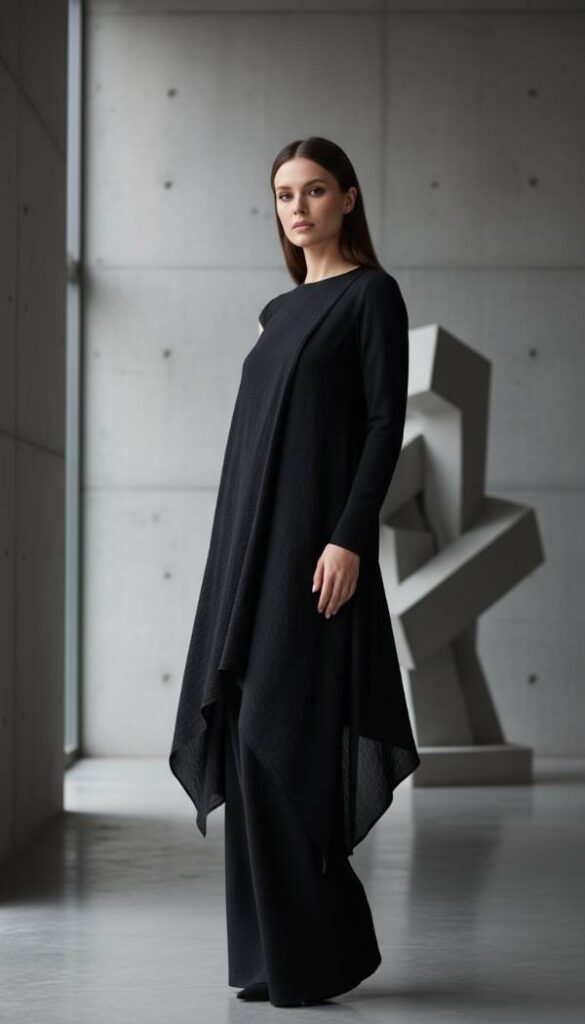 Introduce a touch of avant garde sophistication with an asymmetrical hem tunic top, a key trend for sculptural silhouettes. Made from a premium, fluid jersey or silk blend, its artfully draped design creates dynamic lines that draw the eye vertically and distract from the midsection. The longer, uneven hemline offers graceful coverage over the tummy and hips, while the relaxed yet refined fit ensures ultimate comfort. This versatile piece pairs exceptionally well with slim fit trousers or sleek leggings, providing a modern, elongated profile that feels effortlessly chic and contemporary.