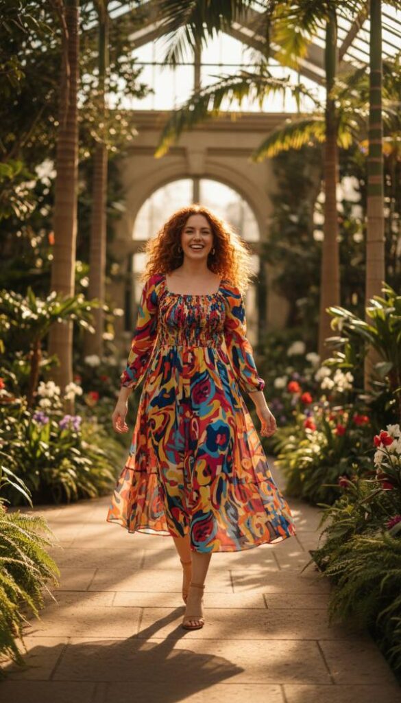Embrace the artistic expression seen on 2025 runways with a printed midi dress featuring a delicately shirred bodice. Made from a fluid silk blend, this dress boasts a vibrant, abstract pattern that distracts from the midsection while the expertly shirred top half provides gentle shaping and highlights the bust. The waist is softly elasticated, allowing for comfort, before flowing into a graceful A line skirt that skims the hips and tummy without clinging. This piece offers both visual interest and a flattering fit, perfect for garden parties or chic daytime events, radiating effortless elegance.