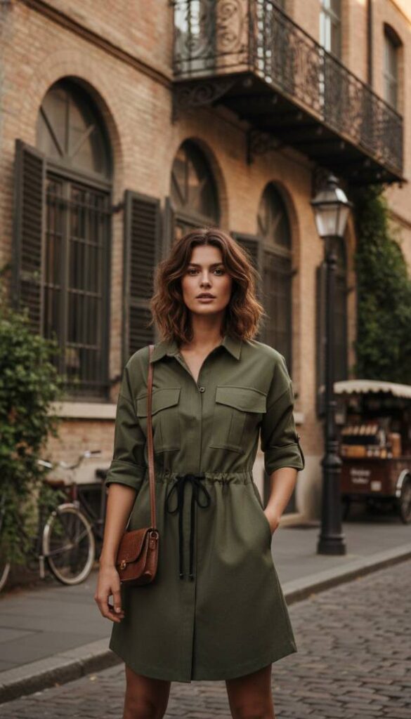 Marrying functionality with high fashion, the utility chic shirtdress with a sophisticated drawstring waist is a key look for 2026. Made from a structured yet soft Tencel blend or washed silk, this dress features clean lines and practical details, like discreet pockets. The adjustable drawstring waist allows for customized cinching just above the tummy, creating a defined hour glass shape while the relaxed fit elsewhere provides comfort and effortlessly skims over the midsection. This piece offers a polished yet adventurous aesthetic, perfect for the modern woman who values both style and practicality.