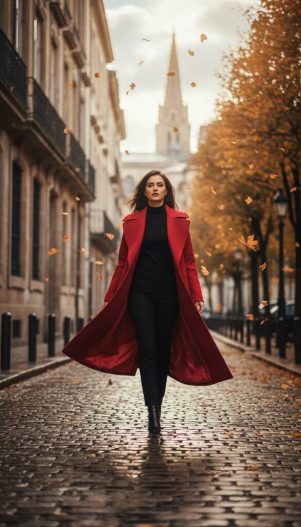 Incorporating the vibrant cherry red trend of 2025/2026 with a powerful statement coat. This impeccably tailored long line coat, crafted from a luxurious wool cashmere blend, offers a striking visual impact. Its clean, straight cut ensures it drapes elegantly over the figure without adding bulk, providing a flattering and sophisticated outer layer that easily conceals a big tummy. The bold color draws the eye, making a memorable fashion statement. Perfect for elevating any outfit, this coat ensures you exude confidence and high fashion flair, even on the chilliest days.