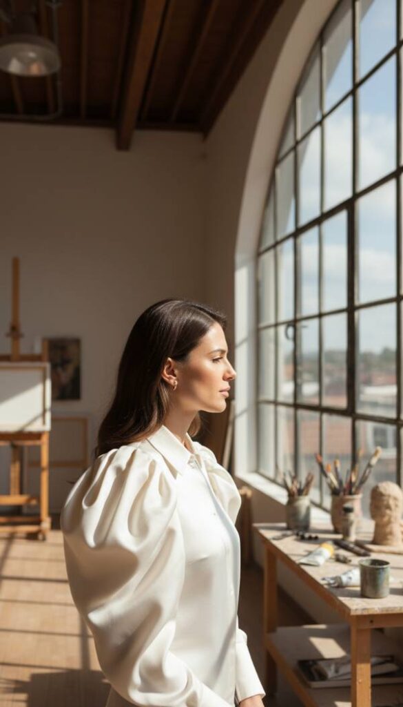 Infuse your wardrobe with dramatic elegance using a sculptural puff sleeve blouse, a nod to the romantic maximalism trending. Crafted from crisp cotton or a luxurious taffeta, this blouse features exaggerated yet artfully structured puff sleeves that draw attention upwards, balancing the figure. The fitted, yet not tight, bodice gracefully skims the midsection, while the overall silhouette creates an appealing hour glass shape. Paired with high waisted trousers or an A line skirt, this piece offers a sophisticated and fashion forward statement that celebrates femininity with a playful yet polished flair.
