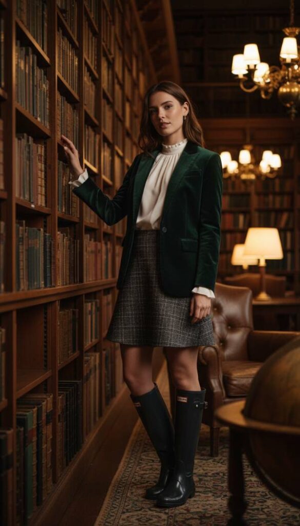 Reinterpret Dark Academia for 2026 with a luxurious, elevated twist that embraces rich textures and deep, sophisticated hues. This ensemble features a meticulously tailored tweed A line mini skirt in a sophisticated charcoal plaid, paired with a sumptuously soft velvet blazer in an opulent forest green or burgundy. A high neck silk blouse in a creamy ivory adds a touch of refined elegance. This scholarly yet sensual aesthetic is completed with knee high Hunter Refined boots, which bring an unexpected, yet perfectly harmonized, blend of practical resilience and academic charm, creating a look that is both intelligent and undeniably alluring.