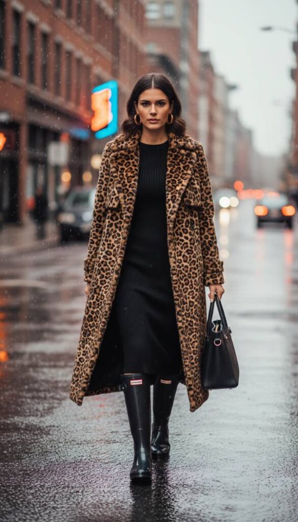 Embrace the opulent extravagance of the modernized Mob Wife aesthetic, a trend that continues to captivate for 2026. This ensemble centers on a luxurious, full length faux leopard print trench coat, its dramatic silhouette offering both protection and undeniable panache. Beneath, a sleek, form fitting black knit dress provides a sophisticated counterpoint, ensuring a polished foundation. Accessorize with oversized gold hoop earrings and a bold, structured leather tote bag. The Hunter boots, perhaps in a glossy black or deep espresso, ground this look with practical urban resilience, making a powerful statement that is both fearless and exceptionally chic.