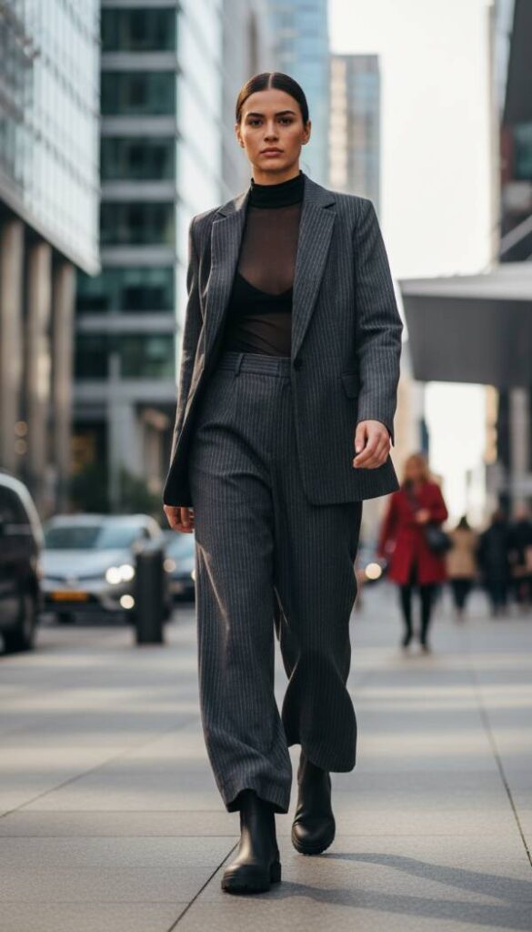Channel the refined assertiveness of the Office Siren, reinterpreted for 2026 with a focus on fluidity and tailored precision. This look features a charcoal grey pinstripe wide leg trouser suit, impeccably cut from a fine wool blend, offering a commanding yet elegant presence. The jacket boasts strong shoulders and a cinched waist, presenting a powerful feminine form. Underneath, a sheer black high neck top adds a touch of understated intrigue. The key is the unexpected pairing with a matte finish black Hunter Chelsea boot, providing a confident stride without compromising on boardroom gravitas. This ensemble masterfully blurs lines between professional rigor and captivating allure.