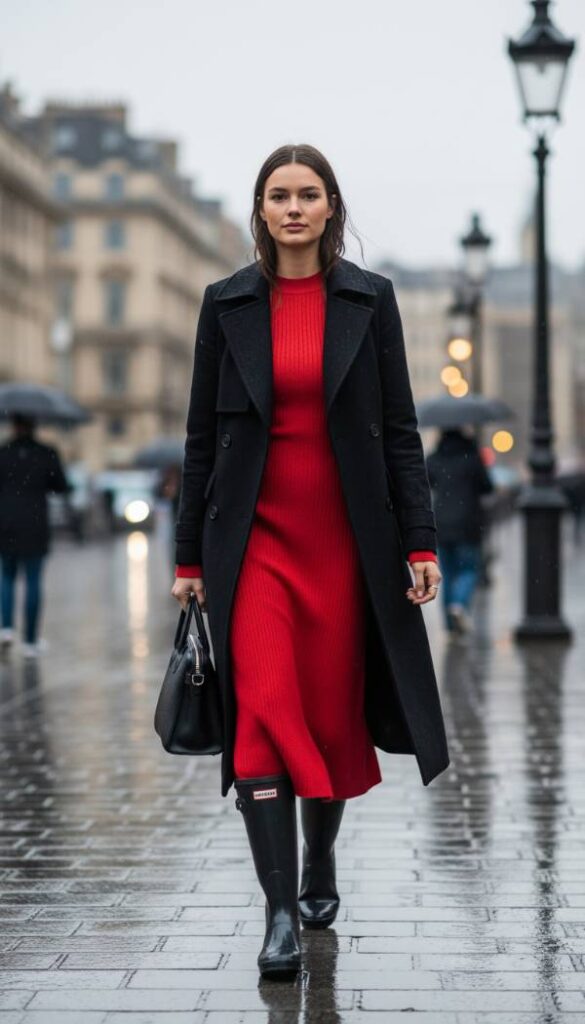Inject a vibrant pulse into your 2026 rainwear wardrobe with the impactful Cherry Red Statement. This look showcases a striking, form fitting cherry red ribbed knit midi dress that hugs the figure elegantly, offering a bold splash of the season’s most coveted hue. Over this, a clean lined, structured black wool coat provides a chic contrast, its minimalist design allowing the dress to truly pop. The ensemble is anchored by glossy black Hunter Original Tall boots, which serve to ground the vivid color while maintaining an air of refined practicality. A small, black leather top handle bag completes this sophisticated, color centric outfit.