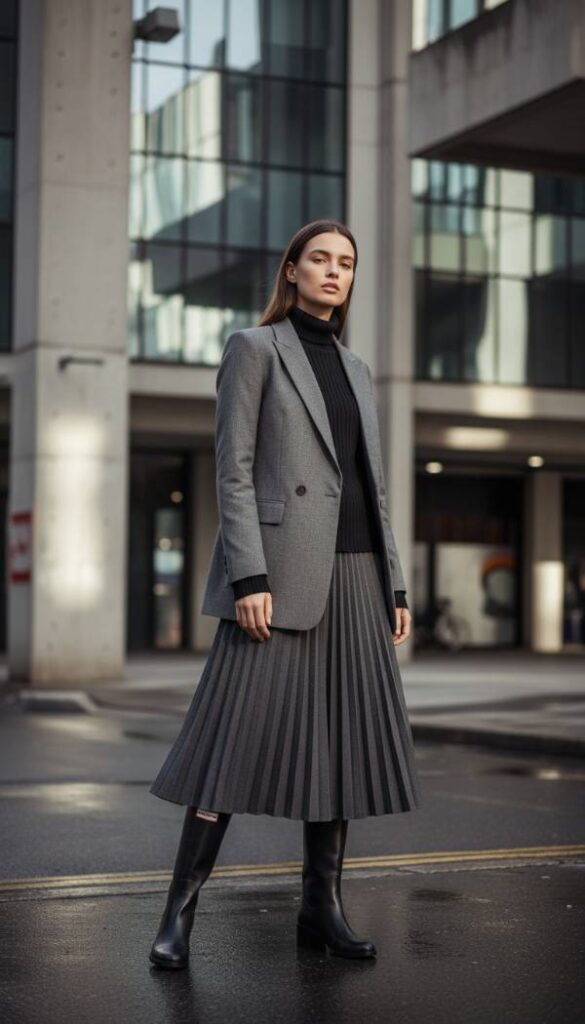 Embrace the art of deconstructed tailoring, a defining trend for 2026 that reimagines classic silhouettes with an avant garde twist. This ensemble features an artfully asymmetric grey marl blazer, its innovative cut offering unexpected lines and a modern, slightly undone elegance. It is paired with a sharply pleated midi skirt in a complementary charcoal hue, creating dynamic movement with every step. A fine gauge knit turtleneck in black provides a sleek base layer. The look culminates with a pair of sleek, block heeled Hunter Refined boots, injecting an element of sophisticated resilience into this conceptually forward fashion statement.