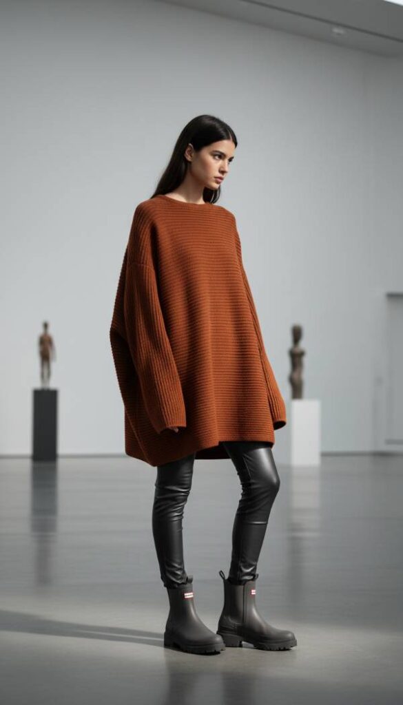 For 2026, embrace the tactile innovation of avant garde textured knitwear, pushing boundaries with unique forms and rich surfaces. This statement piece is a sculptural, oversized knit tunic in an earthy terracotta or charcoal, featuring an intricate cable pattern or an innovative ribbed design that creates a dramatic silhouette. It is paired with sleek, form fitting faux leather leggings, providing a contemporary edge and balancing the volume of the top. The entire look is completed with Hunter Chelsea boots in a muted tone, offering a grounding, functional base while maintaining the outfit’s high fashion integrity.