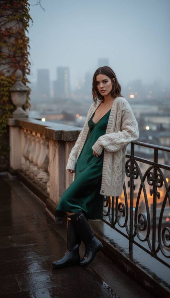 Experience the luxurious evolution of Neo Grunge for 2026, where raw edge sensibilities meet opulent materials. This intriguing ensemble features an oversized, loosely knit mohair sweater in a muted olive or distressed charcoal, embodying an artful nonchalance. Beneath, a delicate, bias cut silk slip dress in a deep burgundy or midnight blue peeks out, its luxurious fabric providing a sophisticated contrast to the sweater’s texture. The subtle peek of lace or raw silk adds a touch of refined rebellion. Hunter Play Tall boots in a contrasting dark tone anchor this look, giving it a practical, streetwise edge that is unexpectedly chic.