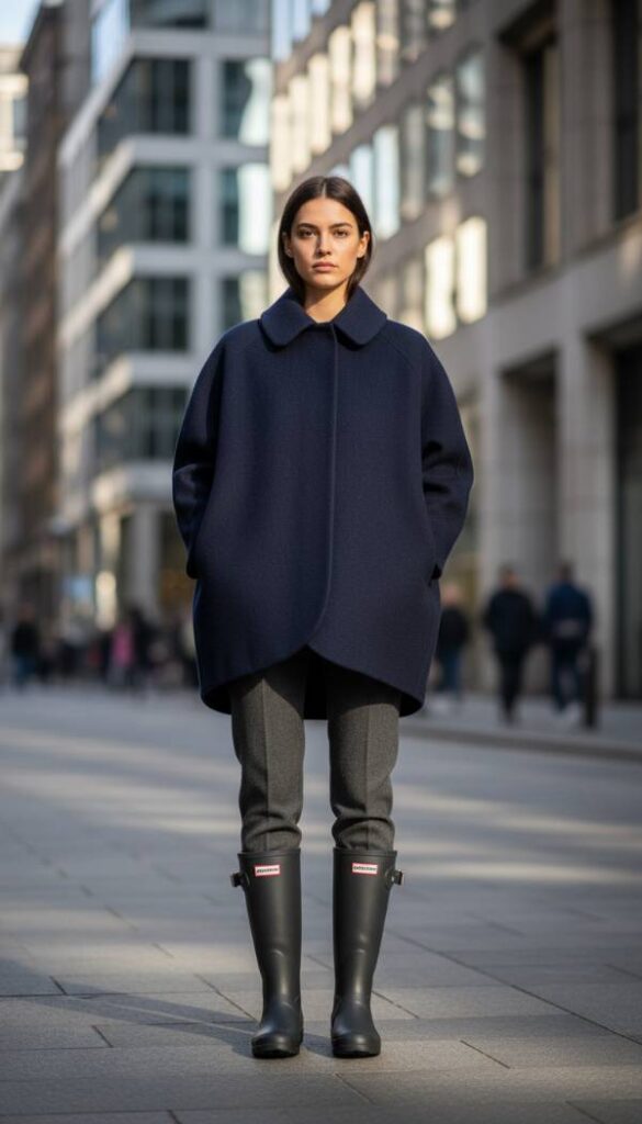Make a bold architectural statement in 2026 with outfits that celebrate sculptural silhouettes and exaggerated proportions. This look features a dramatically voluminous cocoon coat in a rich navy or deep forest green, its rounded shape creating an intriguing, almost artistic form. The coat’s oversized presence is expertly balanced by slim, tailored wool trousers in a complementary dark hue, ensuring a sleek foundation. A high neck cashmere blend top provides refined comfort underneath. The ensemble is completed with Hunter Refined Short boots, adding a touch of practical sophistication while allowing the coat’s grand silhouette to command full attention.