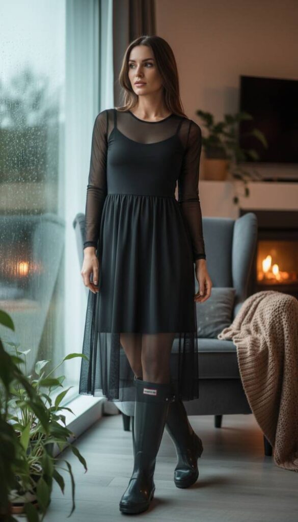 Explore the captivating allure of sheer fabrics and strategic layering, a provocative yet sophisticated trend for 2026. This ensemble presents a delicate, transparent long sleeved mesh midi dress in black or deep plum, designed to be worn over a sleek, opaque slip dress in a matching or contrasting jewel tone. The interplay of transparency and coverage creates an intriguing visual depth, hinting at form without revealing all. This ethereal layering is grounded by the rugged elegance of Hunter Original Tall boots, which add a practical, confident anchor to the delicate femininity, creating a compelling balance for the discerning dresser.