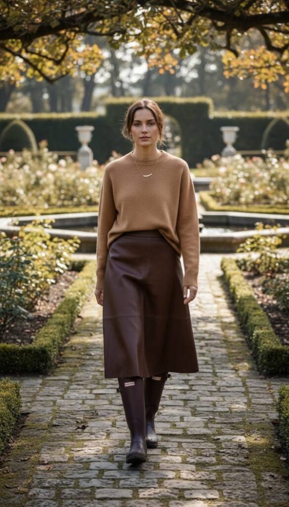 Experience the understated opulence of Stealth Wealth, subtly reimagined for 2026 with an emphasis on unparalleled quality and sophisticated discretion. This luxurious pairing features a sumptuously soft, oversized cashmere crewneck sweater in a sophisticated camel or dove grey, exuding comfort without sacrificing elegance. It is perfectly complemented by a high waisted, full grain leather midi skirt, its clean lines and rich texture speaking volumes of its superior craftsmanship. A minimalist gold chain necklace offers a hint of quiet adornment. Deep plum Hunter Tall boots add an unexpected, yet perfectly integrated, touch of practical luxury to this refined rain ready look.