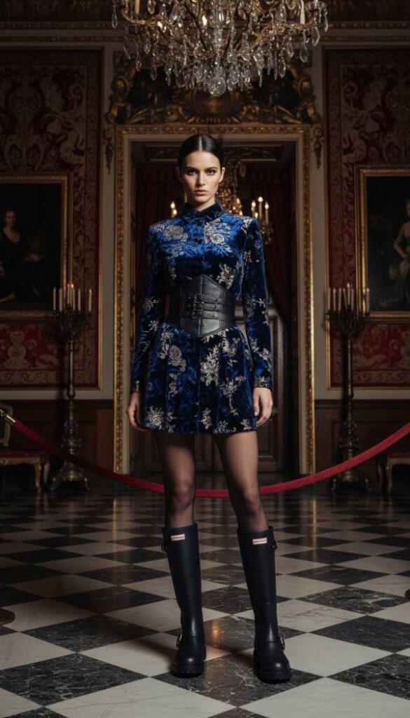 Transporting historical grandeur into 2026, the Baroque Revival is reimagined with a modern, streamlined sensibility. This captivating outfit features a luxurious, rich velvet brocade mini dress in a deep jewel tone like sapphire or ruby, its intricate pattern exuding opulent charm. To define the silhouette and add a contemporary edge, a wide, structured leather corset belt cinches the waist, creating a powerful feminine form. Sheer black tights complete the legwear. This dramatic yet sophisticated look is expertly grounded by sturdy, combat inspired Hunter Refined Commando boots, offering a striking juxtaposition of historical richness and urban resilience, perfect for a chic evening out.