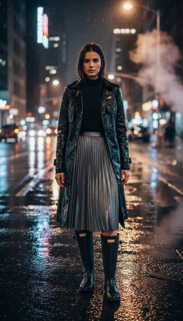 For a touch of futuristic glamour in 2026, embrace the subtle yet impactful allure of metallic finishes. This ensemble is built around a midi length, iridescent pleated skirt in a gunmetal or petrol blue hue, catching the light with a mesmerizing, liquid like shimmer. Over this, a sleek, patent leather trench coat in black or deep plum provides a contrasting texture and a commanding silhouette, offering both protection and high shine sophistication. A simple black turtleneck completes the base. Glossy black Hunter Original Tall boots perfectly complement the patent leather, elevating this outfit to a dazzling, rain ready masterpiece.